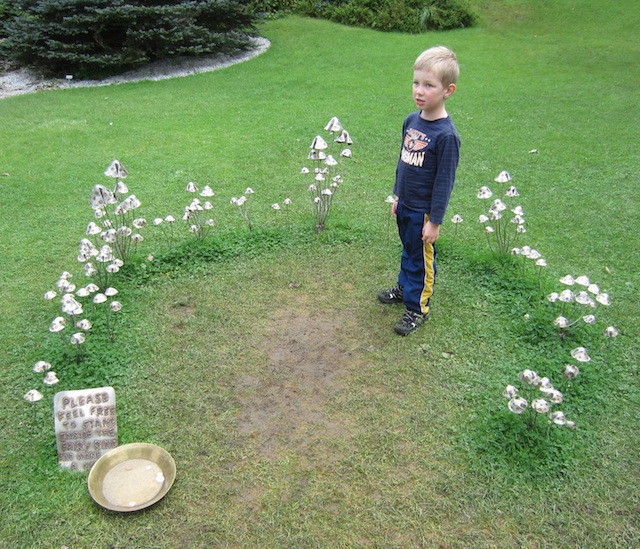 Jacob also discovered a fairy ring. A fairy ring is a ring of mushrooms that appear on a lawn or other grassy area. The story goes like this: An elf or fairy appeared there and it may be a portal to the elf/fairy kingdom. They only last a couple of days. Someone could catch the elf or fairy there as they try to return home. Then he or she must grant a favor. Unfortunately, one of the criteria for a proper fairy ring is that it is made of real mushrooms. These mushrooms, as any clever observer would see, are metal.
